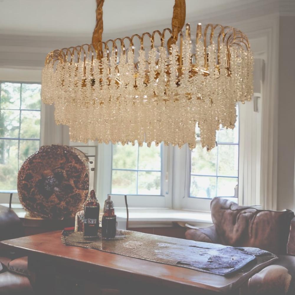 تتميز ثريا عناقيد الكريستال المستطيلة بتصميمها الأنيق والفريد الذي يبتعد عن التصاميم التقليدية. اللون الذهبي يضفي لمسة من الفخامة، مما يجعلها خيارًا مثاليًا لمن يبحث عن ثريات تضيف طابعًا مميزًا إلى الديكور الداخلي.